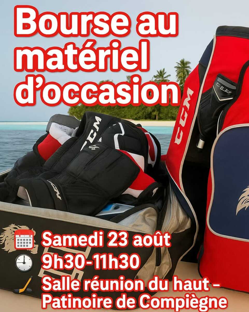 Rendez-vous samedi 23 août, de 9h30 à 11h30, dans la salle de réunion du haut à la patinoire de Compiègne, pour vendre, acheter ou échanger votre matériel de hockey d’occasion. ![]()
